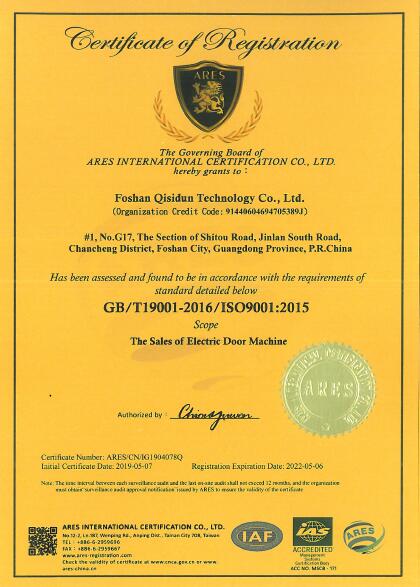 數年的不懈努力,使奇斯盾擁有了強大的生產開發技術隊伍,伸縮門生產車間,工業門生產車間、數控注塑配件車間,電控設備車間及產品開發部。企業還通過了ISO9001:2000質量管理體系認證、歐州CE質量安全標準認證和經國家技術監督局檢驗合格。